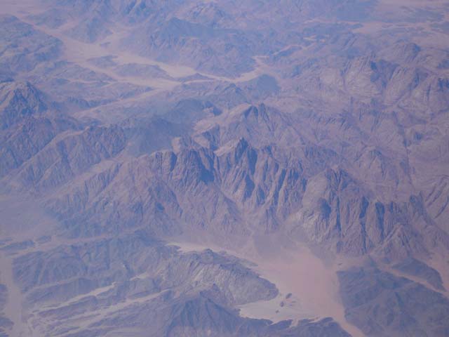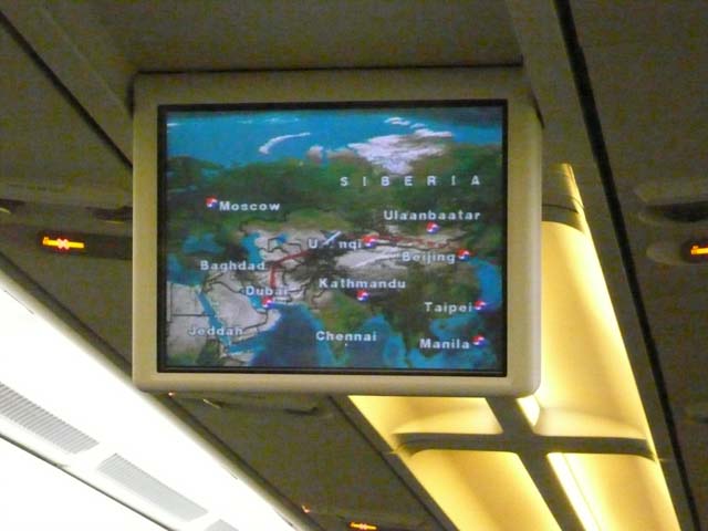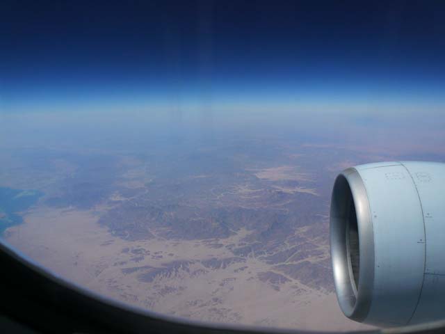| 日本⇔カイロは、途中でソウル、ドバイで乗り継がなければならない。 飛行時間の合計は15時間。ほぼ1泊。 こんな調子なので、機内食は4回出る。 大韓航空の機内食はとてもおいしかった。 航空路は大圏コース(最短コース)ではなく、何度も曲がっている。 政情不安定な国(○スタンとか…)の上空を避けるためらしい。 |