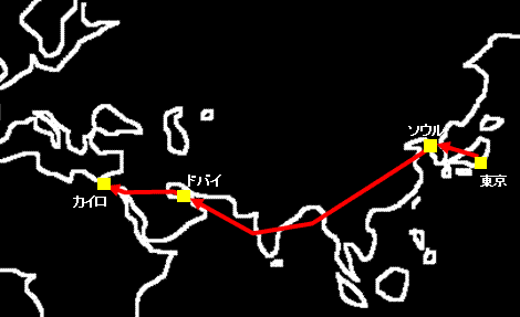 [エジプト]⇒サウジ⇒[ドバイ]⇒イラン⇒トルクメニスタン⇒ウズベキスタン⇒カザフスタン⇒中国⇒[韓国]⇒[日本]