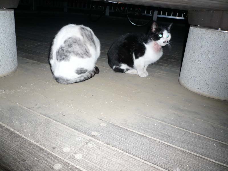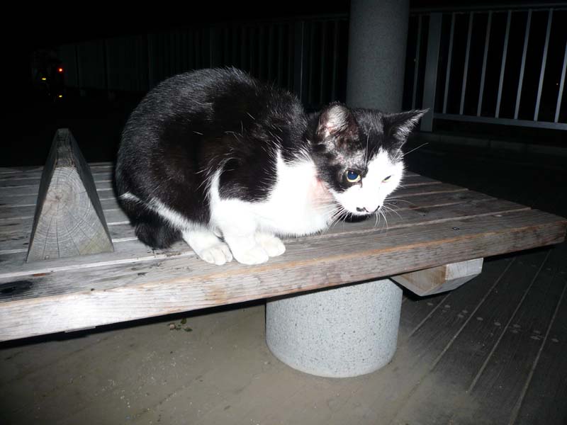 埠頭で夜景写真を撮っていると猫4匹くらいが寄ってきた
