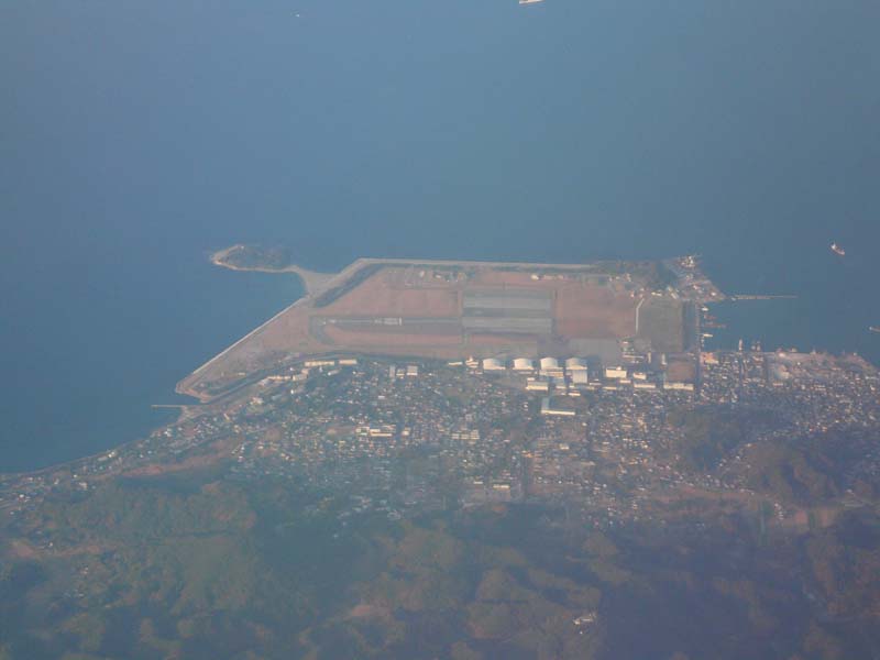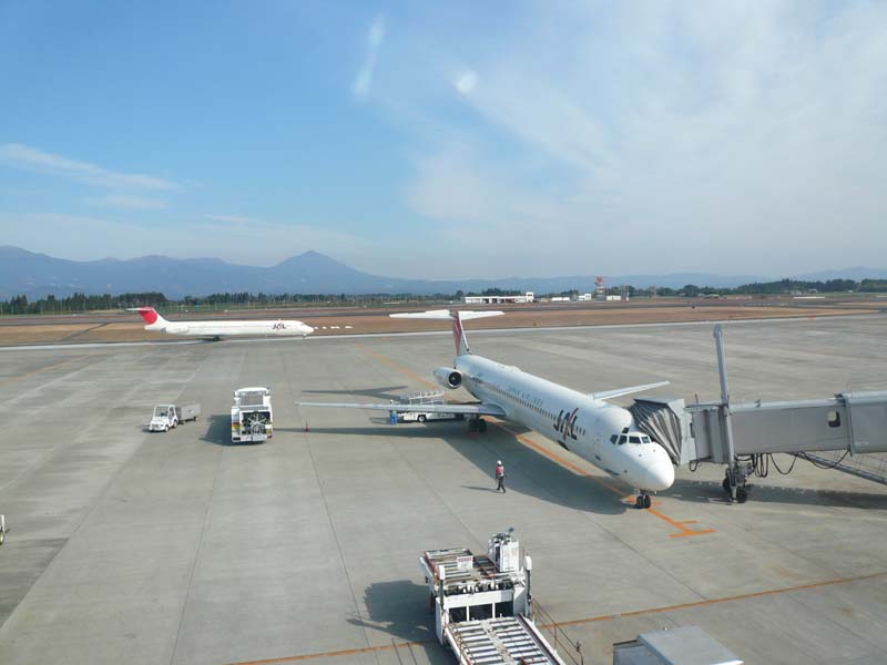 鹿児島空港 背景には宮崎県境の山々が。中央は高千穂峰。1574m、距離21km