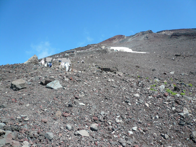 8合目のあたりで植生限界となり、植物は姿を消す。残雪が見え始める。