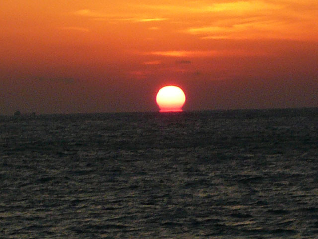 水平線が見える。高さ20mの最上位甲板から見える水平線までの距離は15.9km。
