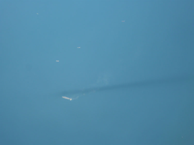 自機の飛行機雲の陰が海面に映っている。