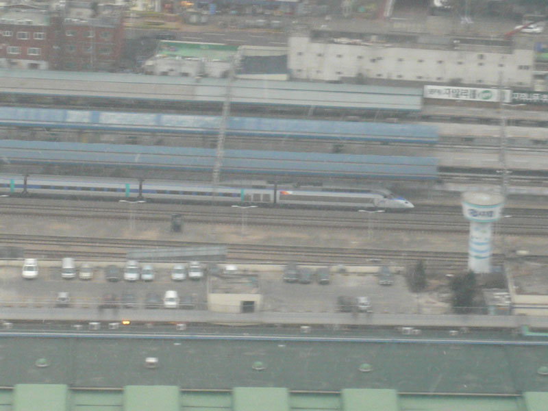 鉄道駅をKTXが通過する。速度は100kmhくらいか?
