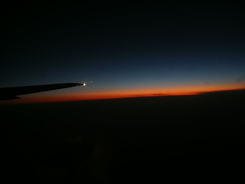 定刻に離陸し、37,000ftの夕闇の中を飛ぶ。