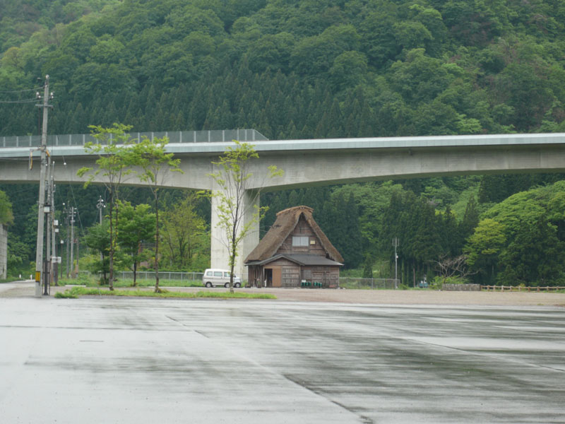 茅葺屋根のすぐ裏に高速道路は、どうみてもシュールな光景である。