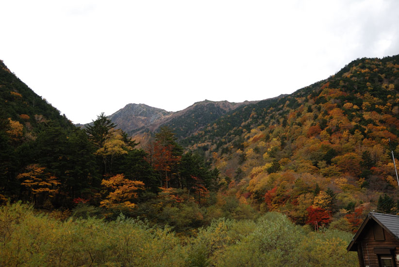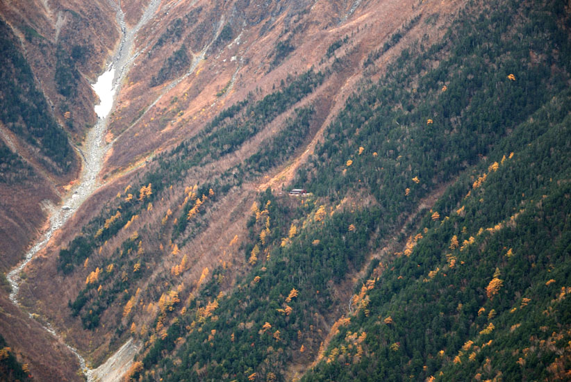 左は大樺沢(おおかんばさわ)と、中央に見えるのが白根御池小屋。
