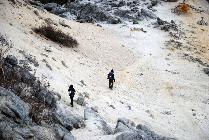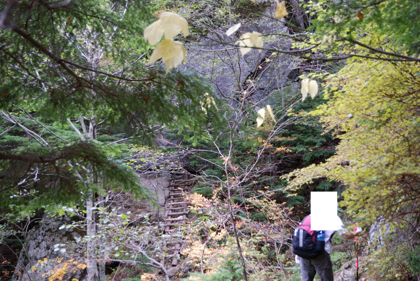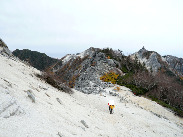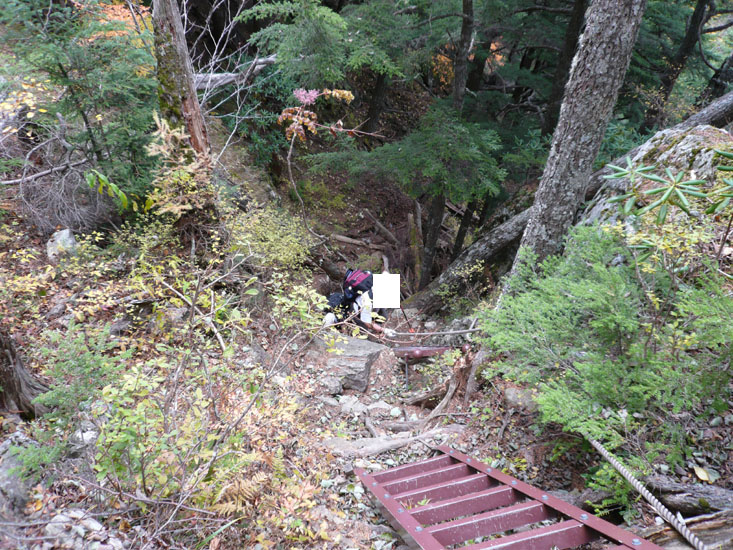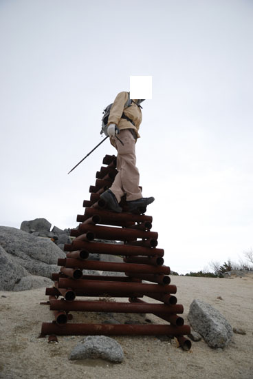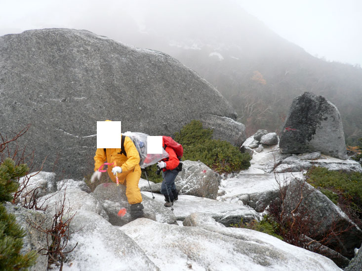 雪は岩場のステップを埋めて、激しく進みにくい。