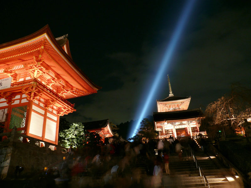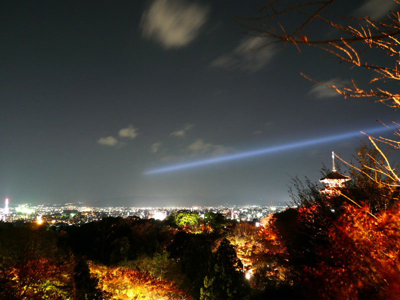 ライトアップのビームが京都の街中へ向かっていく。