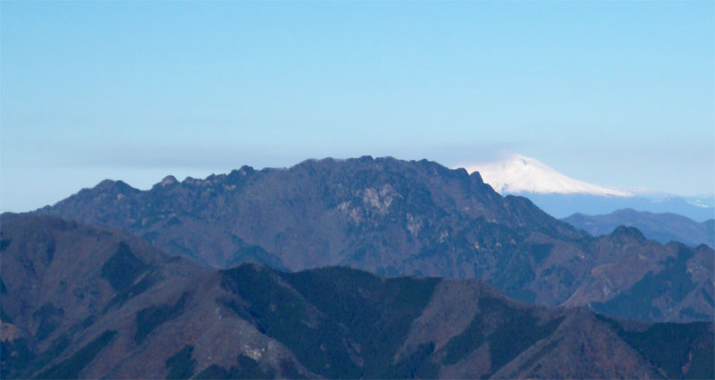特異な形をした両神山と、その奥には真っ白の浅間山が見える。