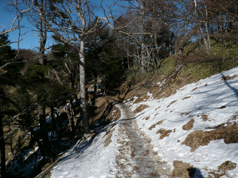 雪があるが、このへんまではずっとアイゼンを装着しながらの下降になったので、