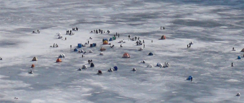 ワカサギ釣りのテントが大量に設営されている。