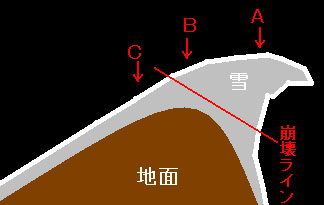 A・・・雪庇の頂上。明らかに危険。