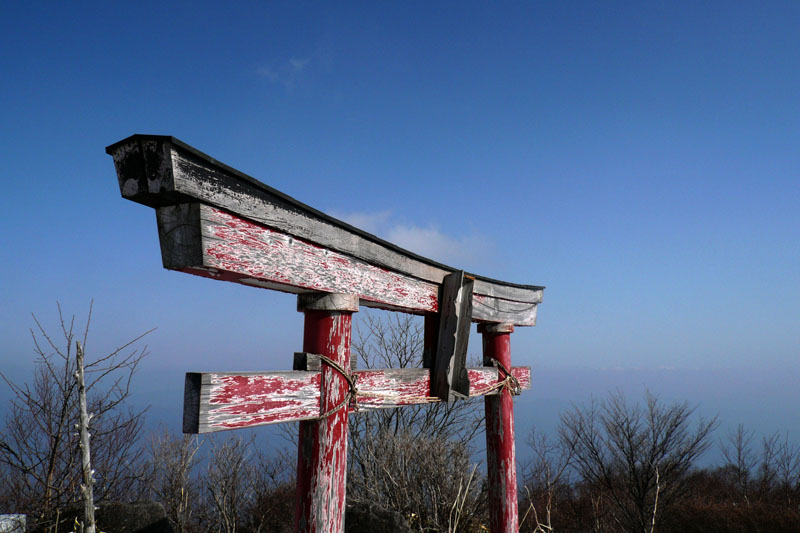 長年の厳しい気候により鳥居はかなりくたびれている。