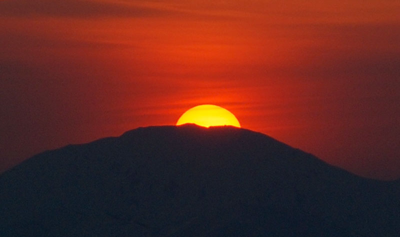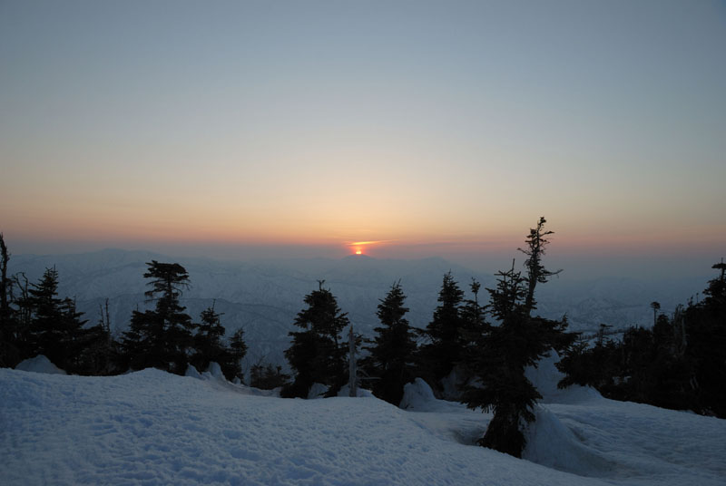 遠く、中ノ岳(2085m)山頂へ夕日が沈む。