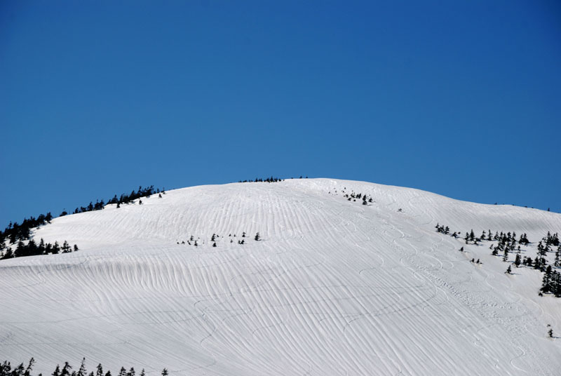 山頂近くはのっぺりとした感じになっており、縦横無尽にシュプールが刻まれている。