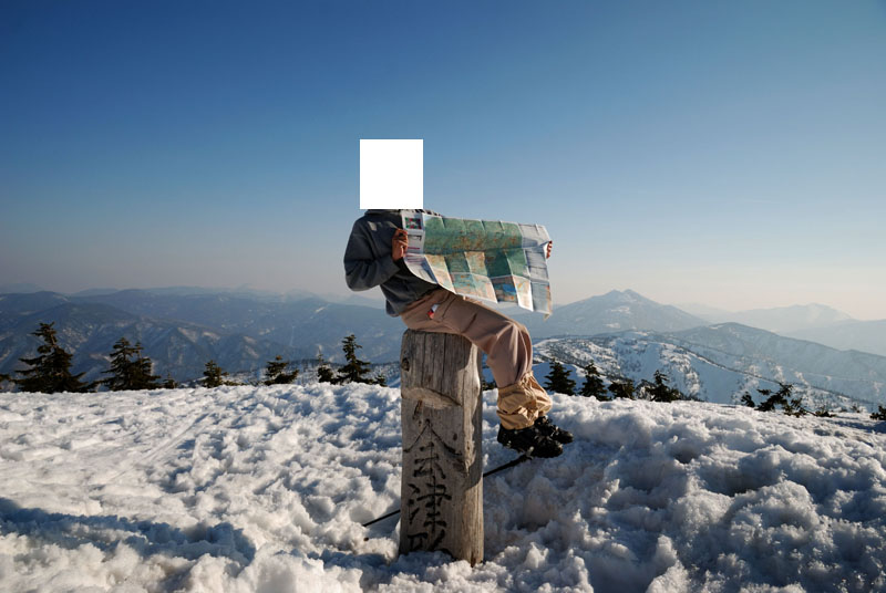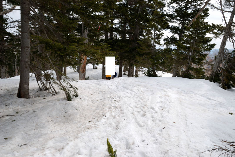 会津駒ヶ岳(2133m)の山頂標識は3m近くある積雪によりかなり埋まっている。
