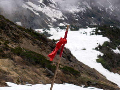 避難小屋から室堂までは竹ざおに赤リボンが設置されており、迷うことはない。