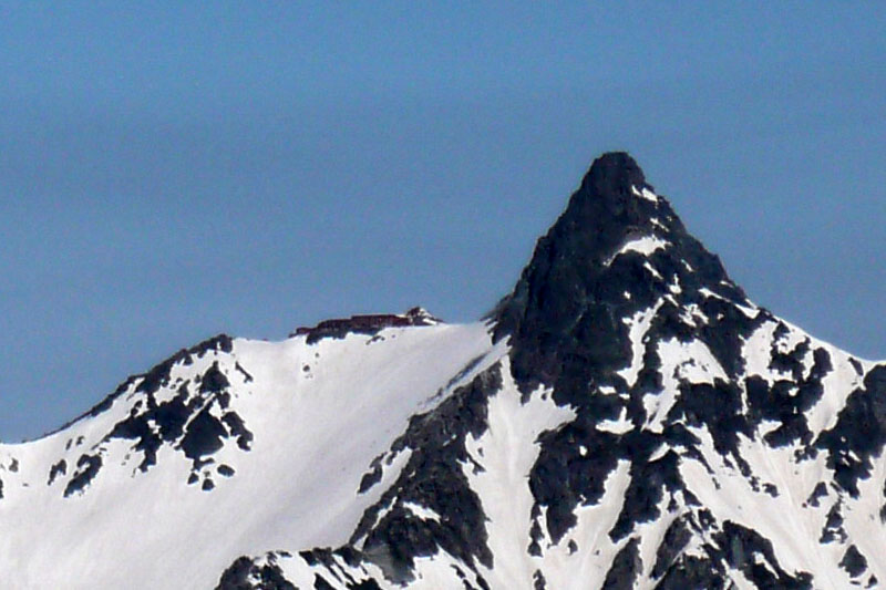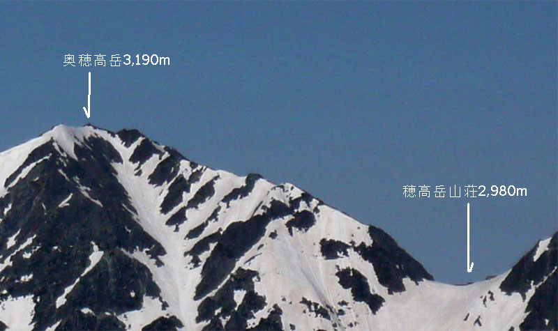 奥穂高岳と、穂高岳山荘。距離8.2km。