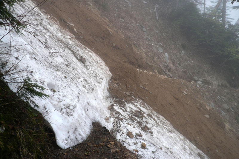 雪渓の上を進むが、時々割れていたりとあまり状態がよくない。