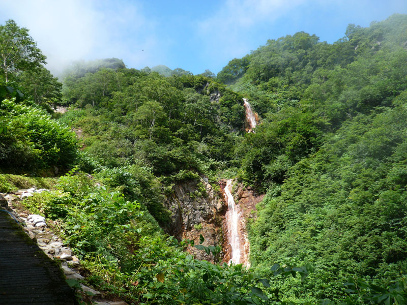 温泉が滝になっている。