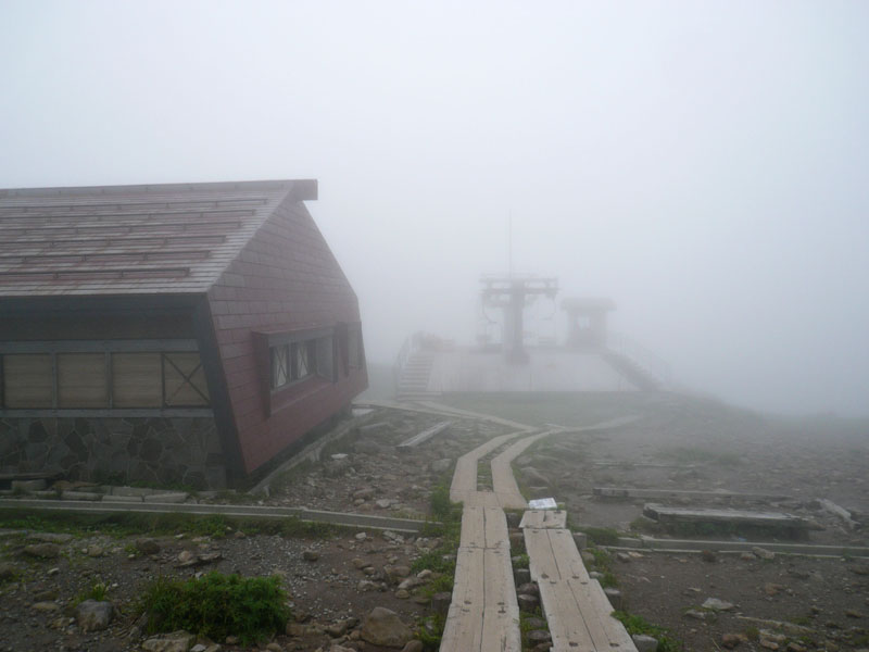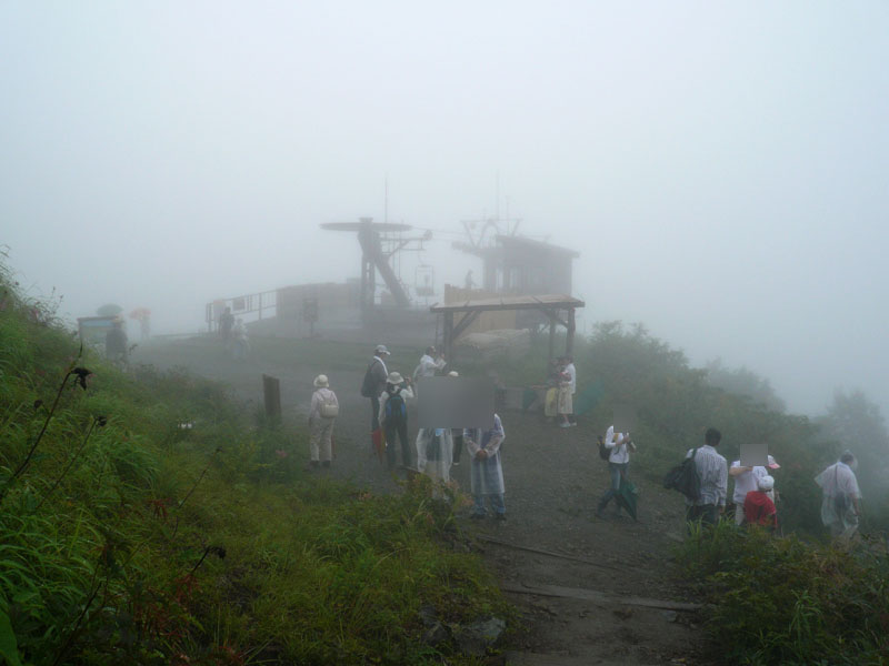 なんと上は雲の中であった。霧雨状態であり、カッパを着ている人多数。