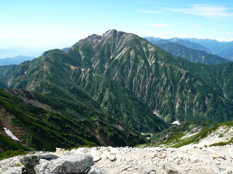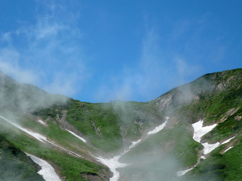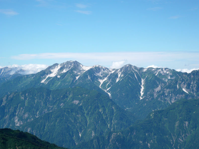 唐松岳から下には巨大な雪渓が残る。