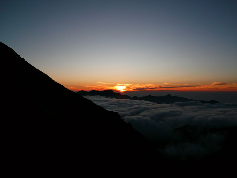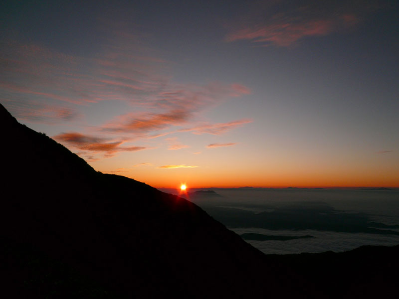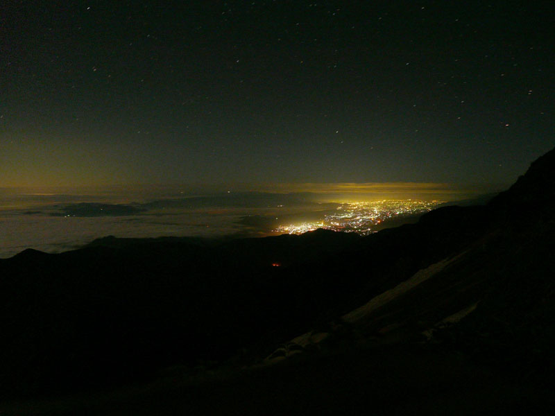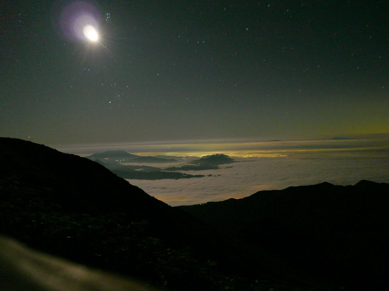 夜は雲海になっていた。雲海の下から下界の明かりが漏れてくる。幻想的な光景。
