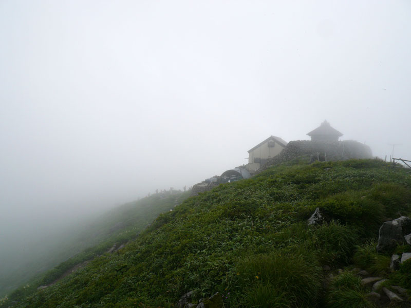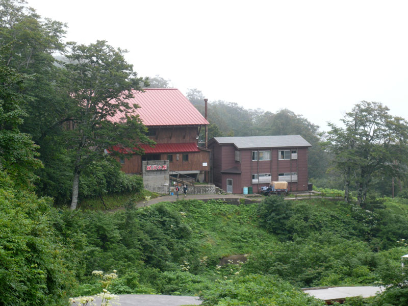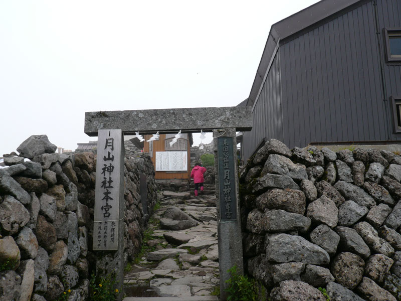 頂上の山小屋と、奥には頂上の月山神社。