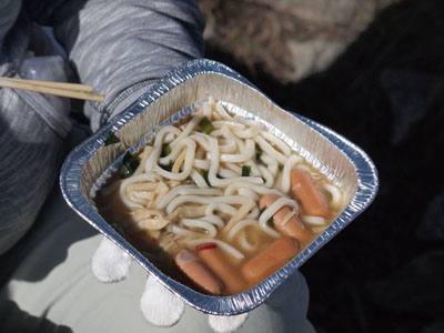 今回は鍋焼きうどん+肉類と、チキンラーメン+かき揚げ