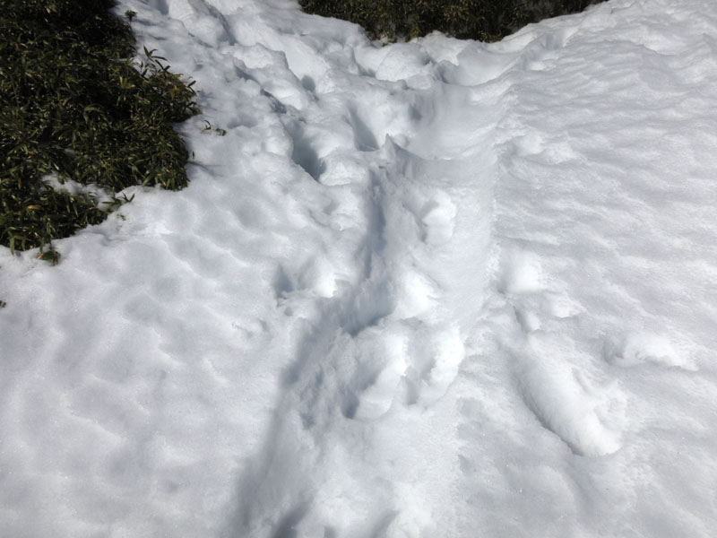よく歩かれ、トレースははっきりしているが、はっきりしていすぎて圧雪されていて滑る。