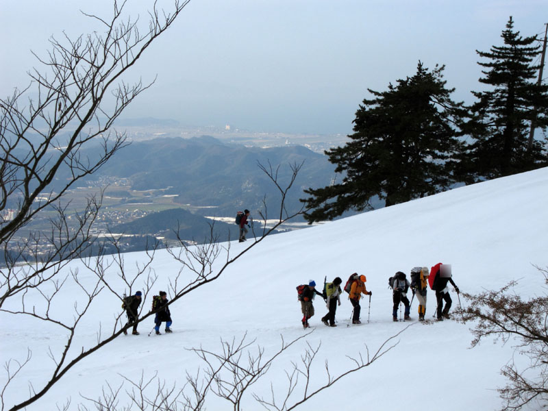 7合目以上はこの急斜面となり、スキー・スノーシューを履いた人は