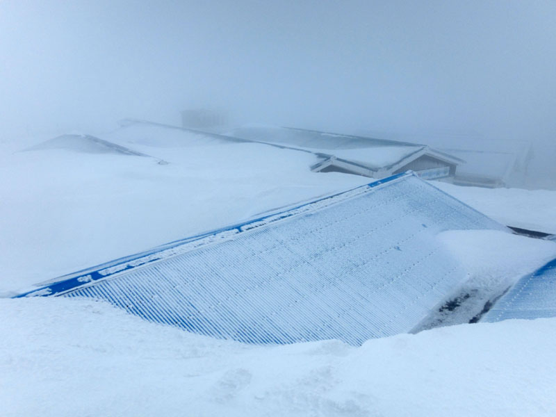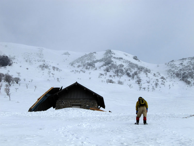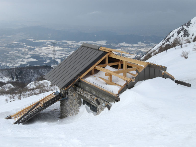 新雪表層雪崩で吹っ飛んだと思われる屋根。