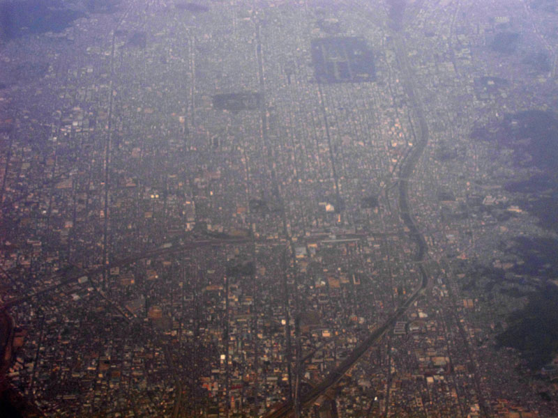 碁盤の目状の町並みは上空から見てもよくわかる。
