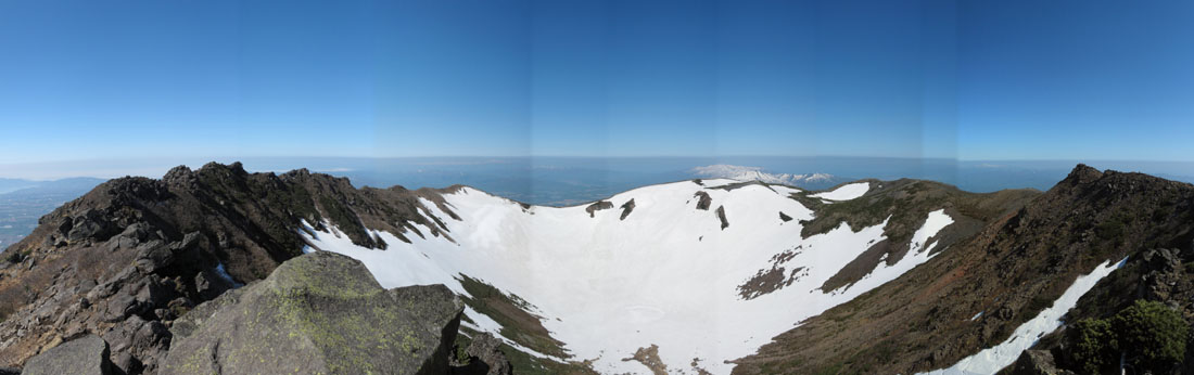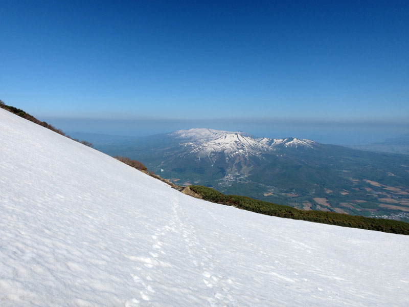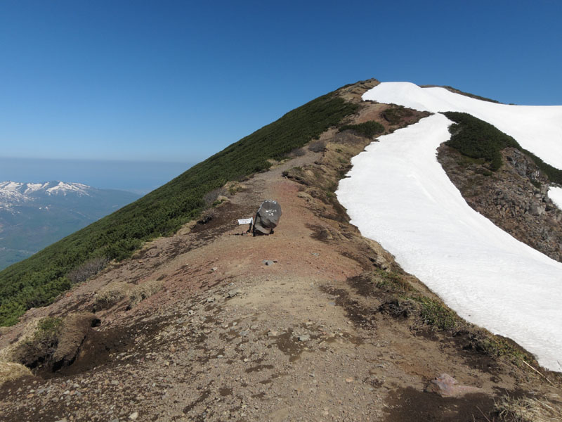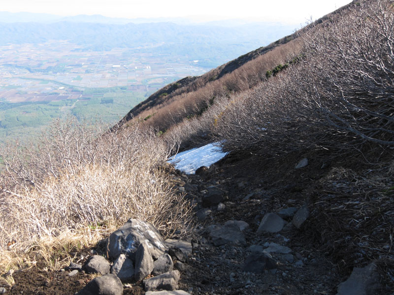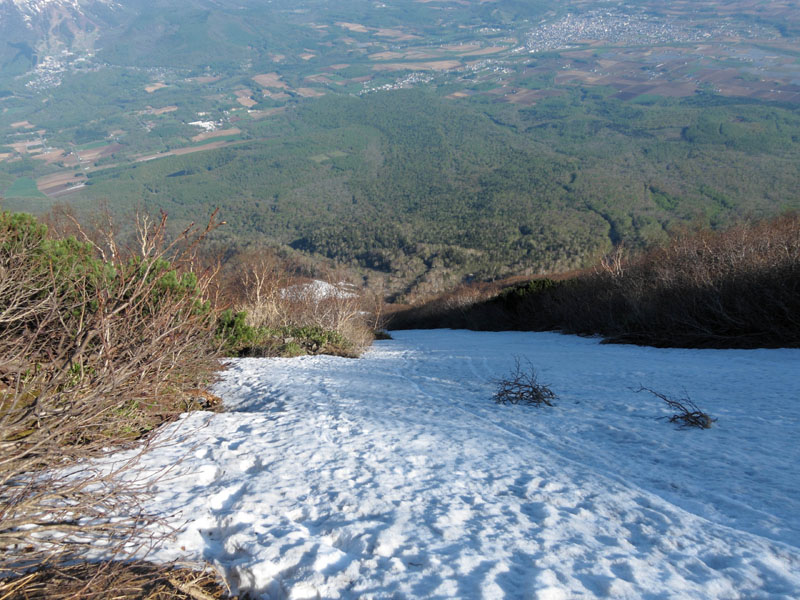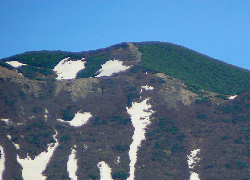 望遠で撮影すると、どうやら上部のあたりまでは尾根上に雪はなく、