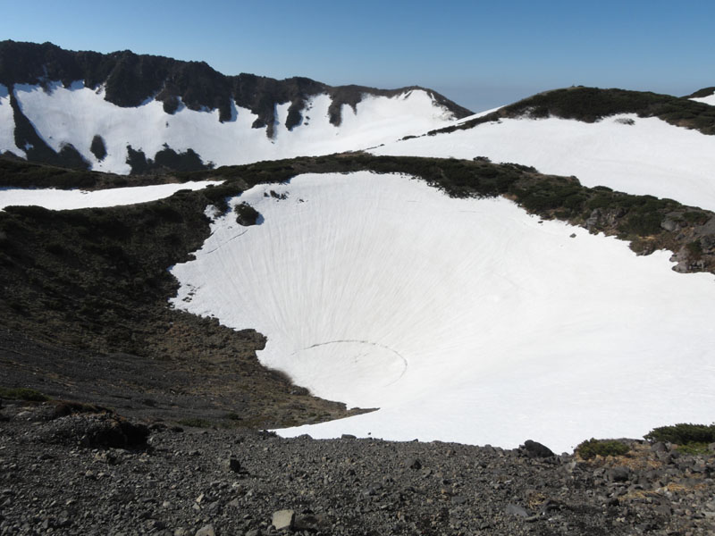 ちょうど中央の雪渓にジグザグに登山道が重なっているのがわかる。