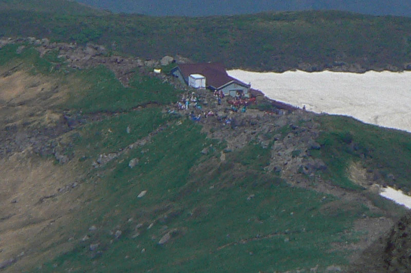 3km離れた御浜小屋を撮影すると、小屋の前にジャージ姿の数十人を確認できる。
