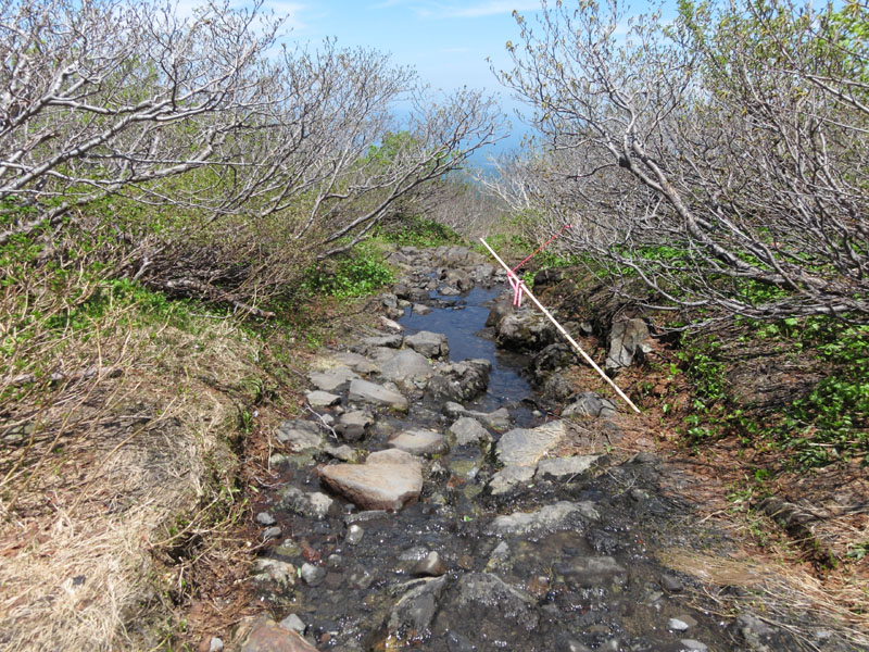 その雪渓を過ぎると雪解け水で登山道が川のごとく。