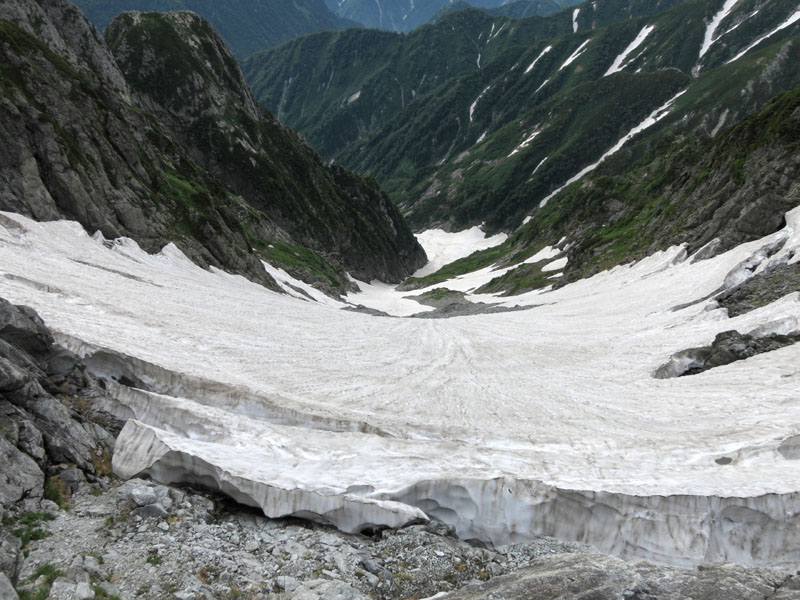はるか下まで続く巨大な雪渓。