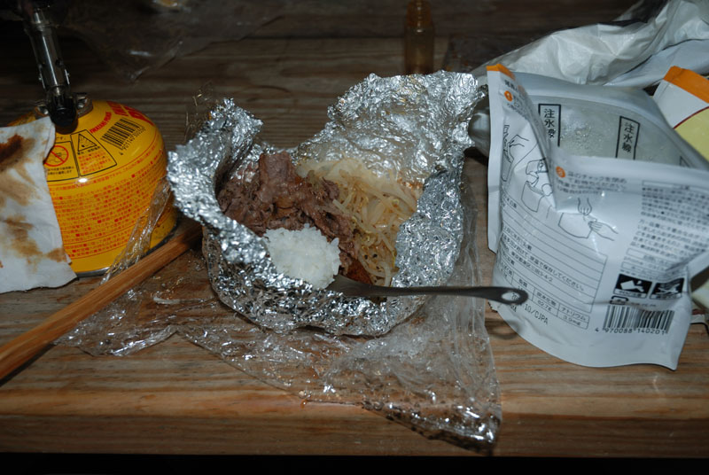 焼肉だが、アルミホイルで包むことで燃料を節約でき、