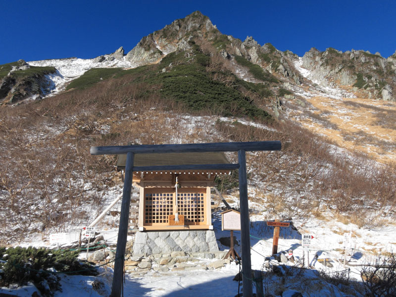 宝剣岳の北側ルートは、岩場が凍結しており軽アイゼンがないと危険。