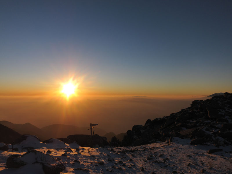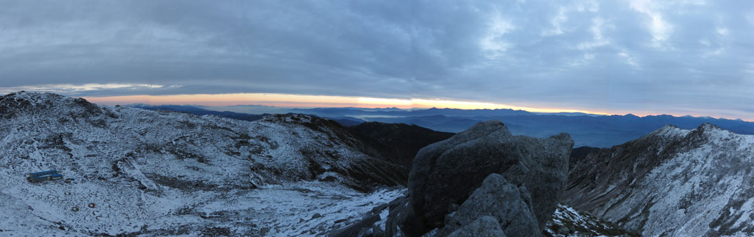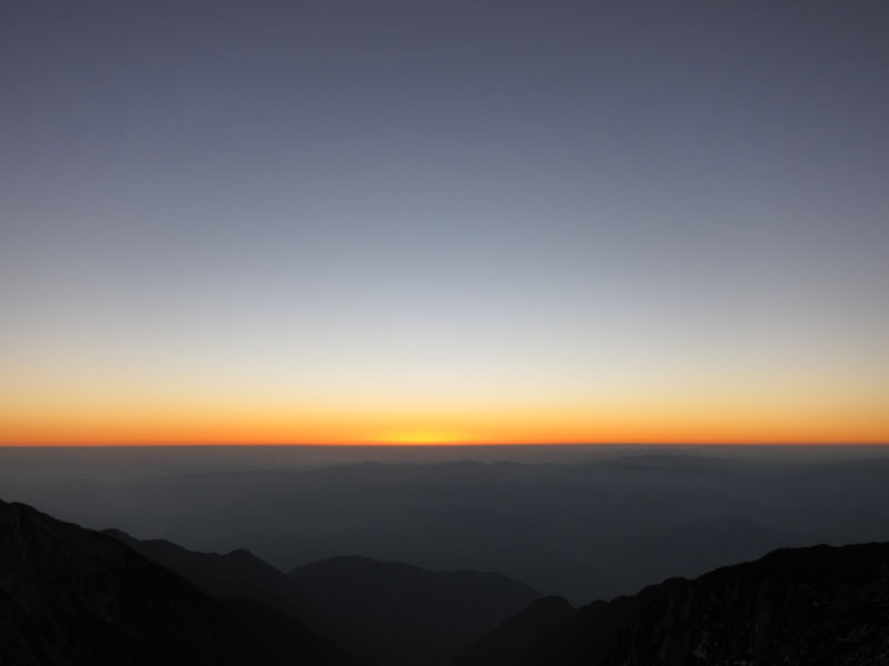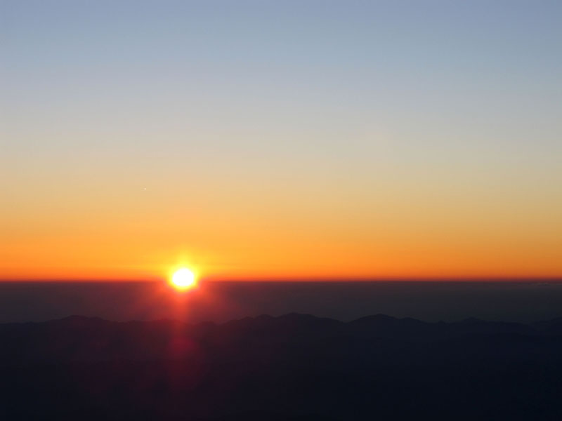 日の出。しかし雲が濃く、太陽は確認できず。残念。