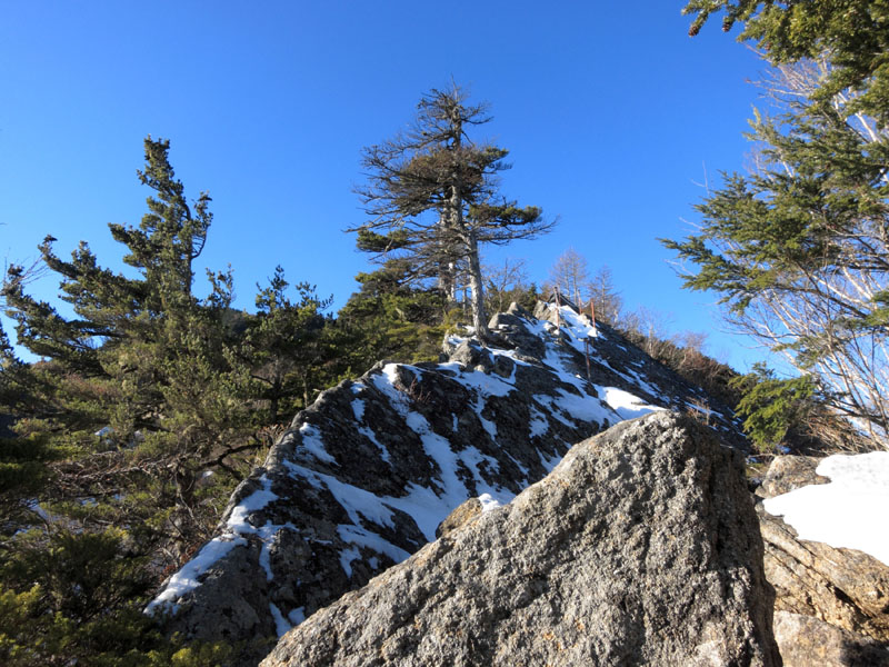 両側がすっぱり切れ落ちている岩場だが、雪は少なく問題はない。