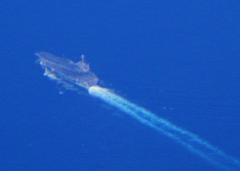 かなり巨大で、上空から見てもタンカーと違って航跡が長いためはっきりわかる。