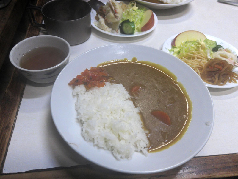 夕食はカレーだ。富士山の山小屋のカレーと異なり食べ放題。