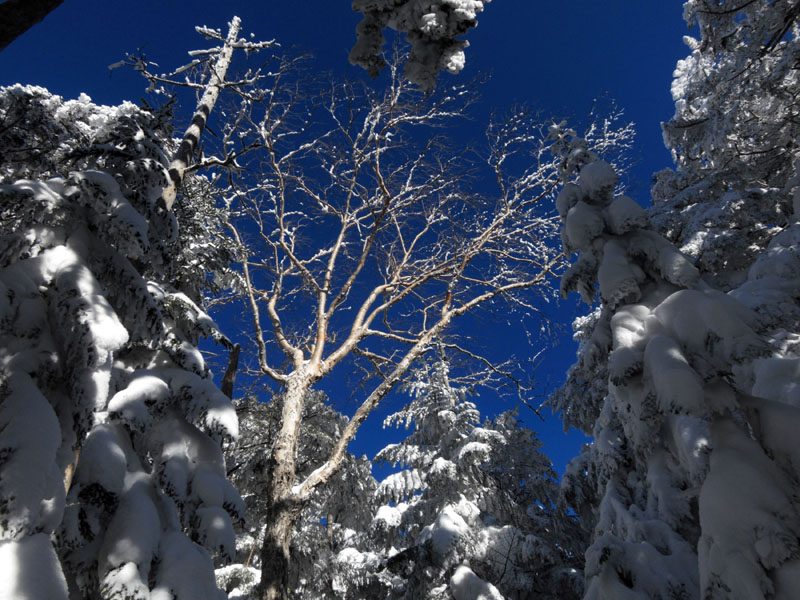 静まり返ったシラビソの森、空がひたすら青い。