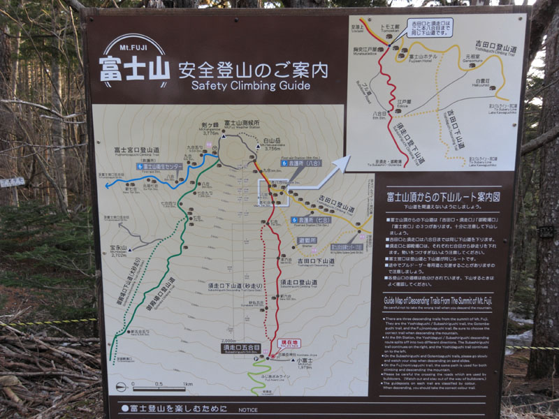 | ■吉田ルート スバルラインが4月27日に5合目まで開通した。 例年は4月頭に開通するのだが、 地震により橋脚がズレるなどの被害を受けたため、 開通が遅れていた。 ■富士宮ルート 地震により盛土の崩壊などがあったため、依然として通行止め。 復旧の目処が立っていないが、夏までには開通させたいとの事。 最も標高が高い5合目(2380m)で、かつ南側のルートなので、 5月・6月の残雪期には重宝するルートなのだが。 ■御殿場ルート 4月末に例年通り開通したが、5合目の標高が低いので、 他の車道が開通する5月以降はあまり利用価値は少ない。 ■須走ルート 例年通り4月末に開通した。 標高は2000mとやや低いのが難点だが、 スバルラインは夜間通行止めのため、 ここは前日入りして高所順応するのには非常に有利。 |