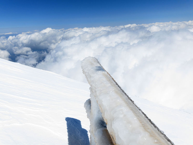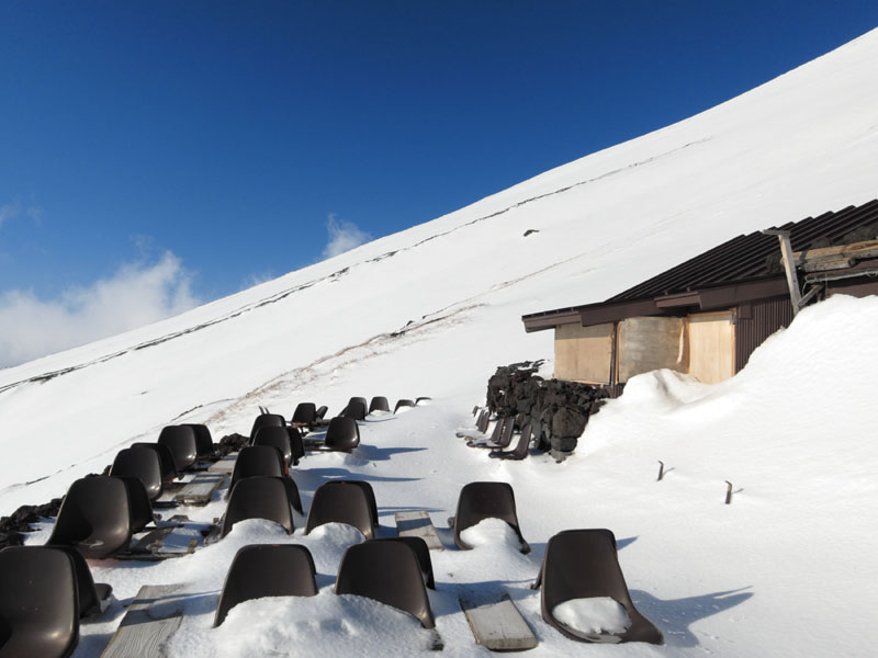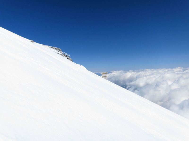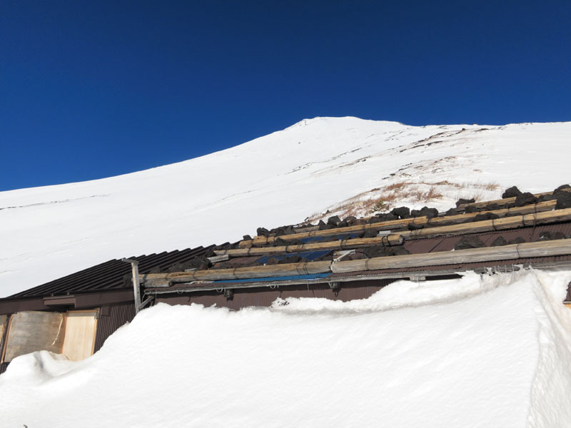 | ■5合目〜6合目 樹林帯は積雪が多いが、アイゼンは不要な感じ。 ■6合目〜7合目 積雪が多く斜度も徐々に出てくるためアイゼンが必要。 ■7合目〜8合目 斜度がかなり出てきて、氷の上に新雪が積もっているため、 アイゼンの効きはしっかりとある。 アイゼン・ピッケル必須だが滑落しても何とか停められそうな雰囲気。 ■8合目以上 氷がやや硬くなり斜度も増してくる。 滑落しても停められるかはちょっと微妙なところ。 |