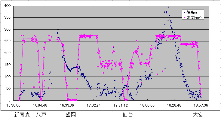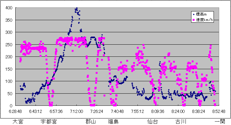 大宮宇都宮間でほぼ235km/h・宇都宮福島間でほぼ270km/hまで出ている。