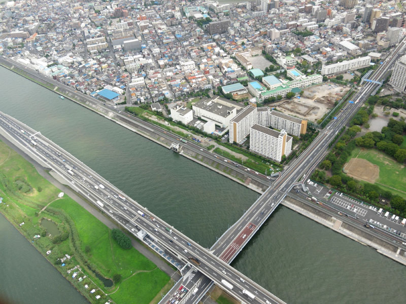 首都高の中央環状線が荒川の堤防上を走っている。